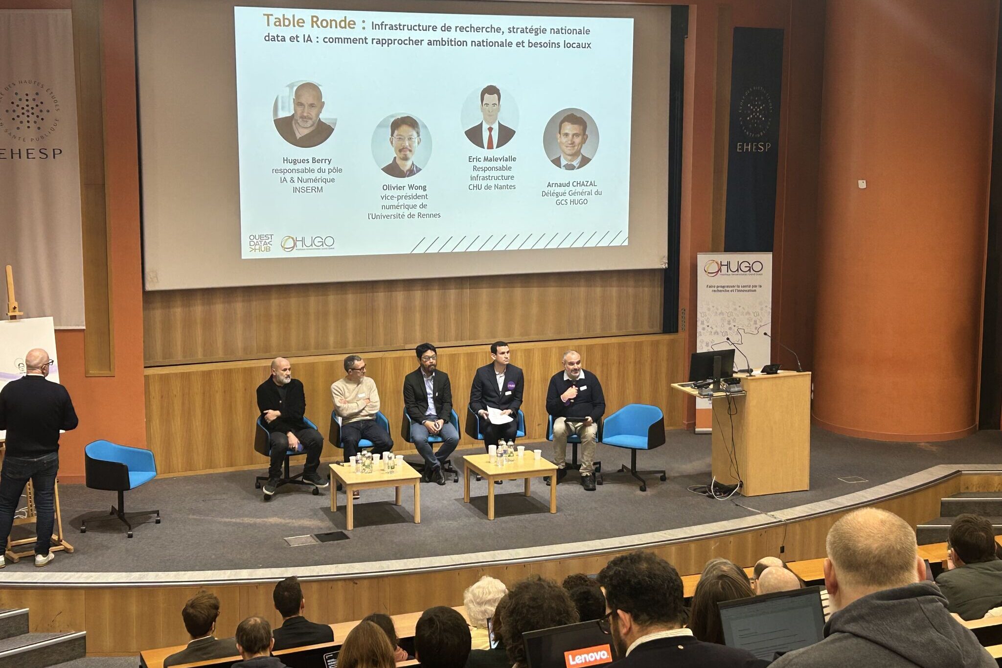 Le GCS HUGO organisait le 17 décembre 2025 sa 2e Journée Ouest Data Hub à l’EHESP à Rennes. Etaient réunis plus de 200 chercheurs, cliniciens, data scientists, partenaires industriels, académiques et institutionnels, issus du Grand Ouest (Bretagne, Pays de la Loire et Centre-Val de Loire) mais également d’autres régions françaises et de l’étranger, confirmant l’attractivité et le rayonnement de la démarche. Cet événement se veut le rendez-vous bisannuel du GCS HUGO pour témoigner de la dynamique engagée autour des données massives en santé et du potentiel offert par leur utilisation secondaire à des fins de recherche et d’innovation.